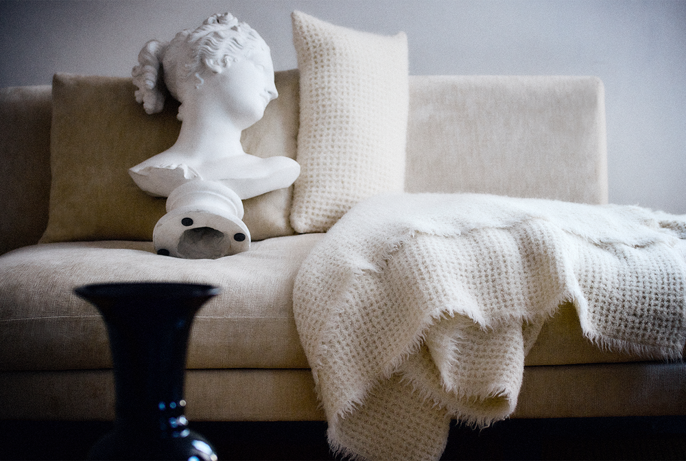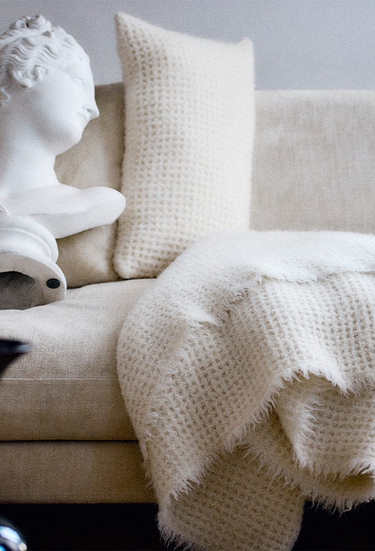 Among the new throws, PON in bouclé alpaca features a macro-lattice relief with a voluminous, textured effect; TAI, in pure virgin wool, expresses geometric rigour with a delicate tie motif; MAC, also in bouclé alpaca and wool, is inspired by Aran knitting with a dynamic, iridescent weave.