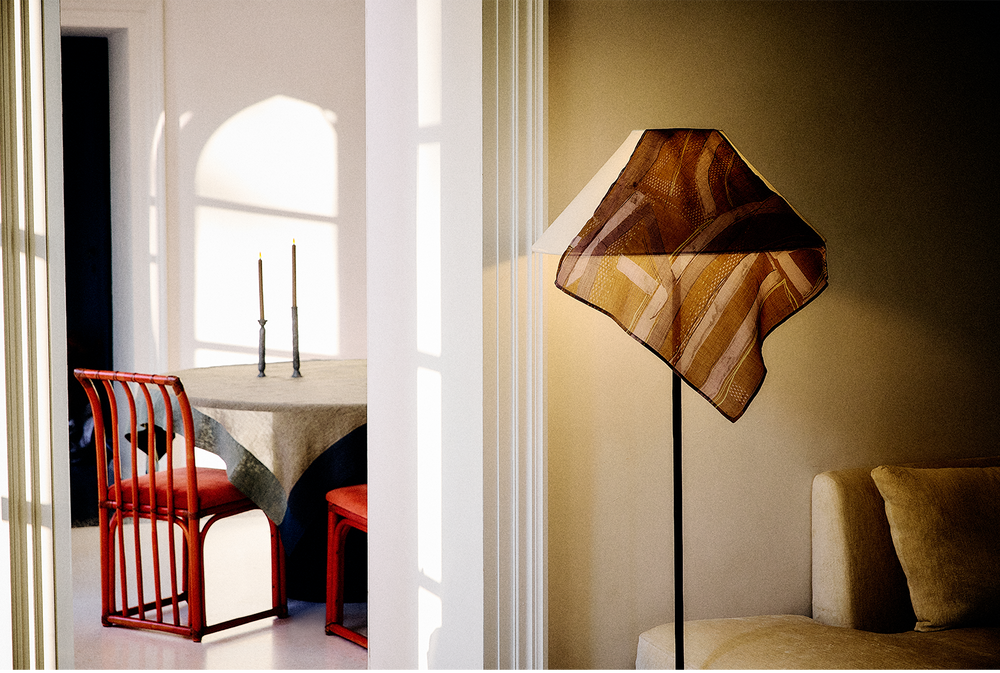 The table is dressed with refinement through tablecloths that blend tradition and innovation. BER, in abaca, reproduces a nineteenth-century sketch by Anthony Berrus intended for cashmere shawls, preserved in the Limonta archives.