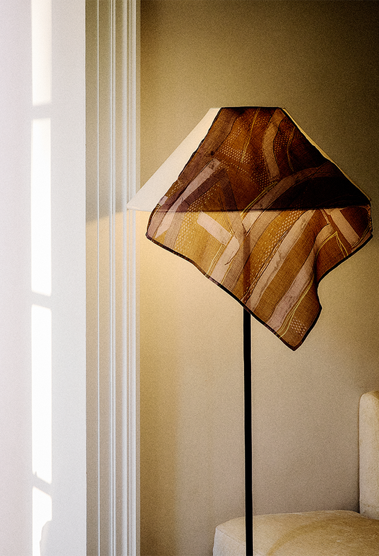 TULI brings watercolour tulips to the fore, dissolving on the surface. TRAMA, in pure linen, plays with the weave of the threads, creating an iridescent effect and an abstract, oversized chessboard. FRAM, on the other hand,